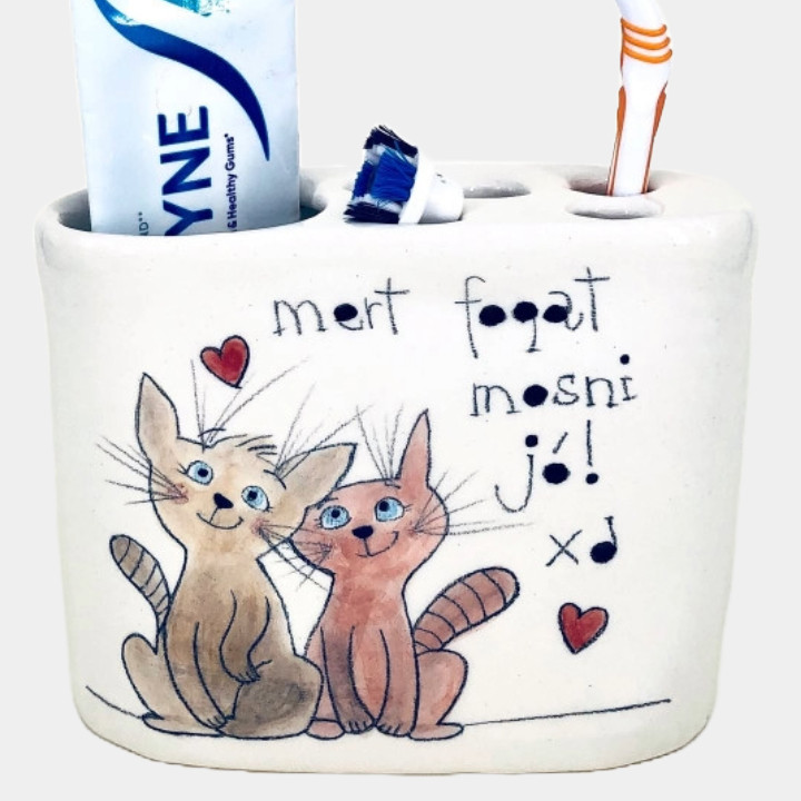 Kézzel készített és festett kerámia fogkefetartó, cicás mintával, kedves felirattal.