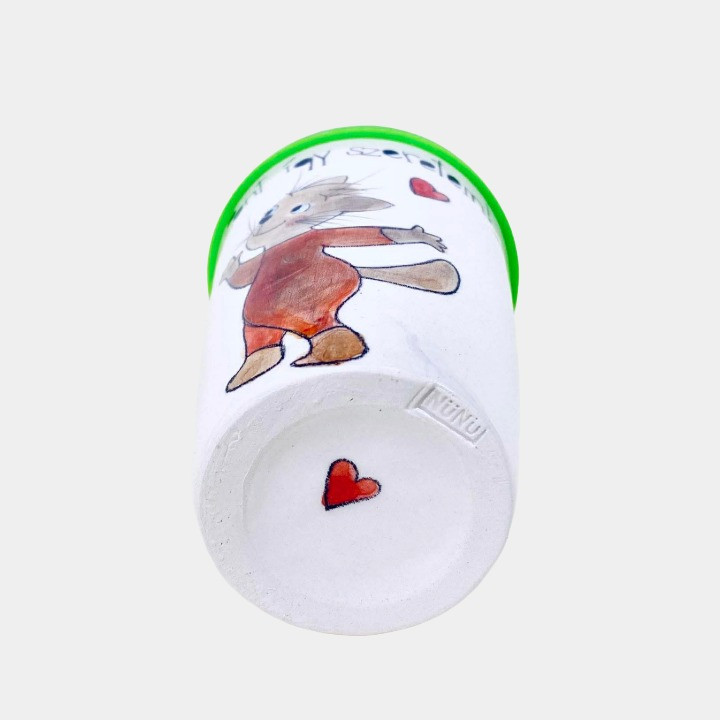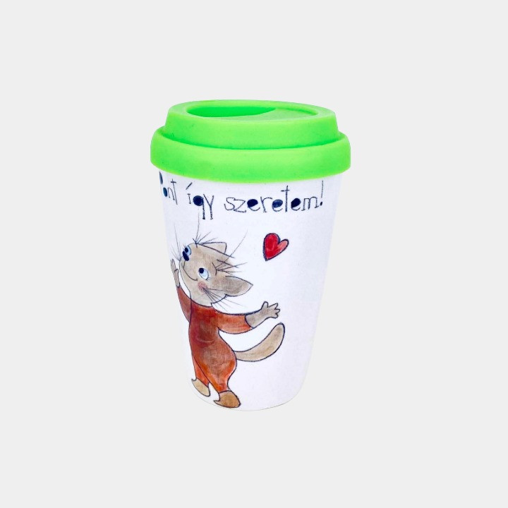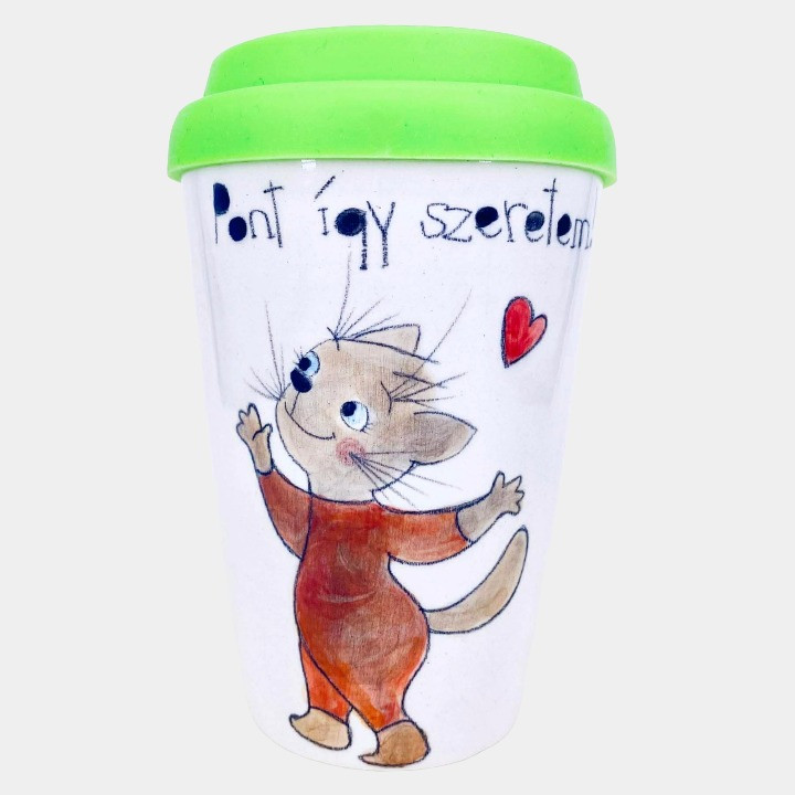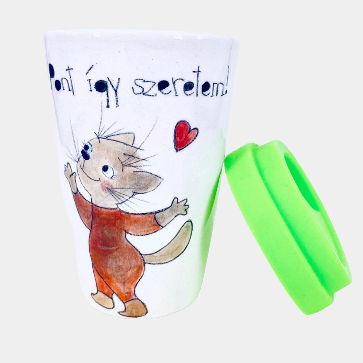 Kézzel készített és festett fül nélküli bögre, cicás mintával, kedves felirattal, szilikon tetővel.