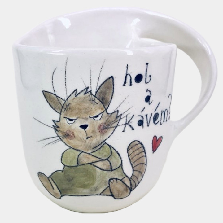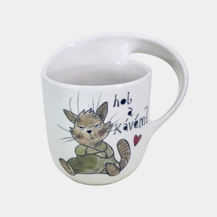 Kézzel készített és festett bögre, cicás mintával és vicces felirattal.
