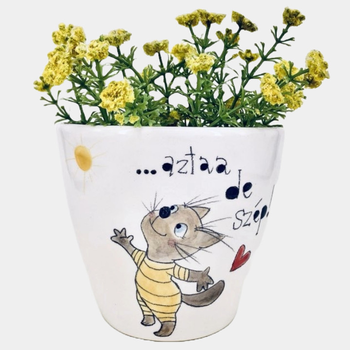 Kézzel készített és festett kaspó, cicás mintával, vicces felirattal.