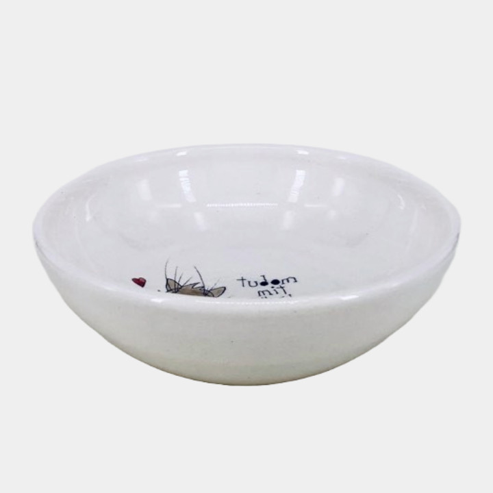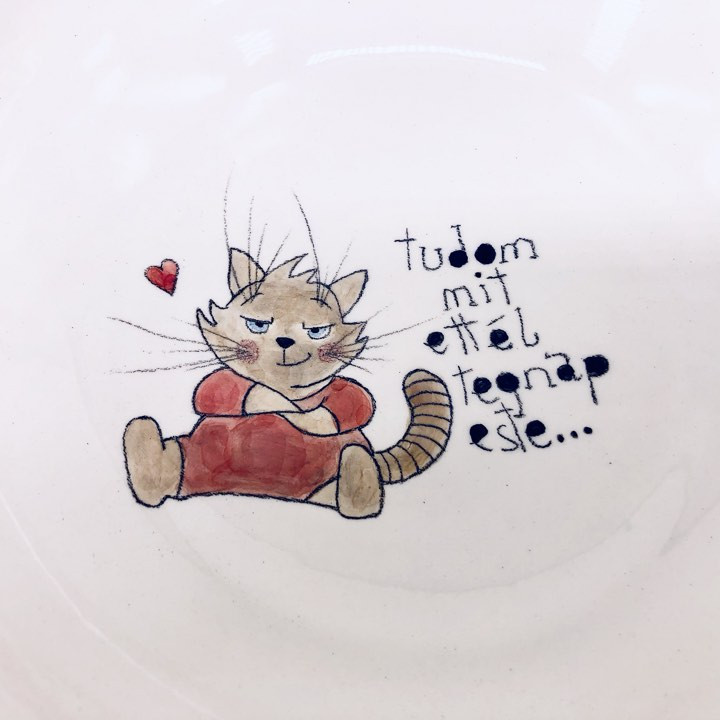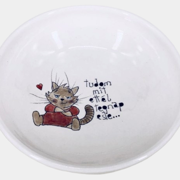 Kézzel készített és festett mélytányér, cicás mintával és vicces felirattal.