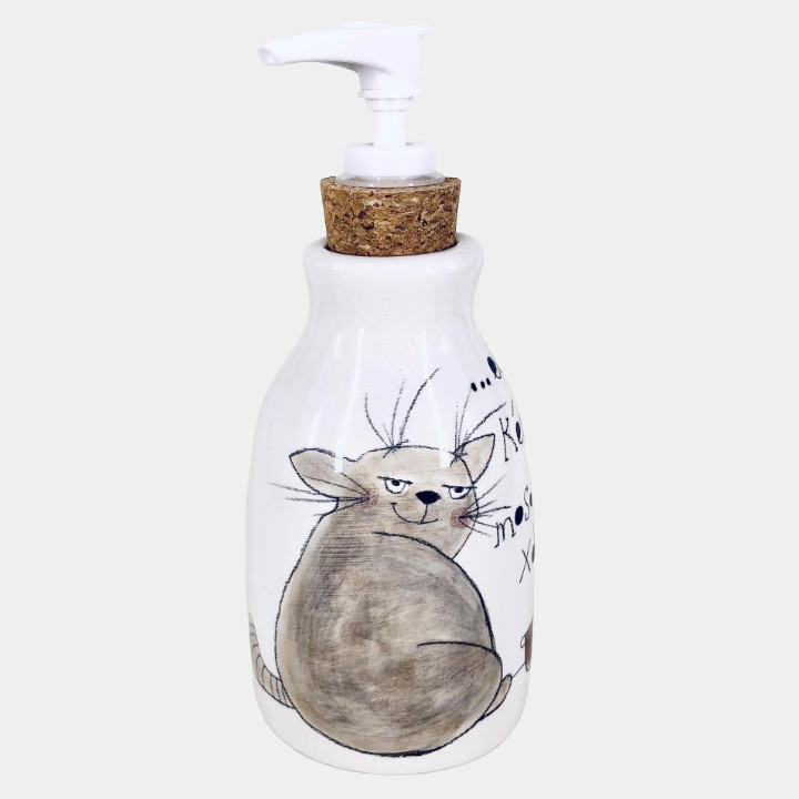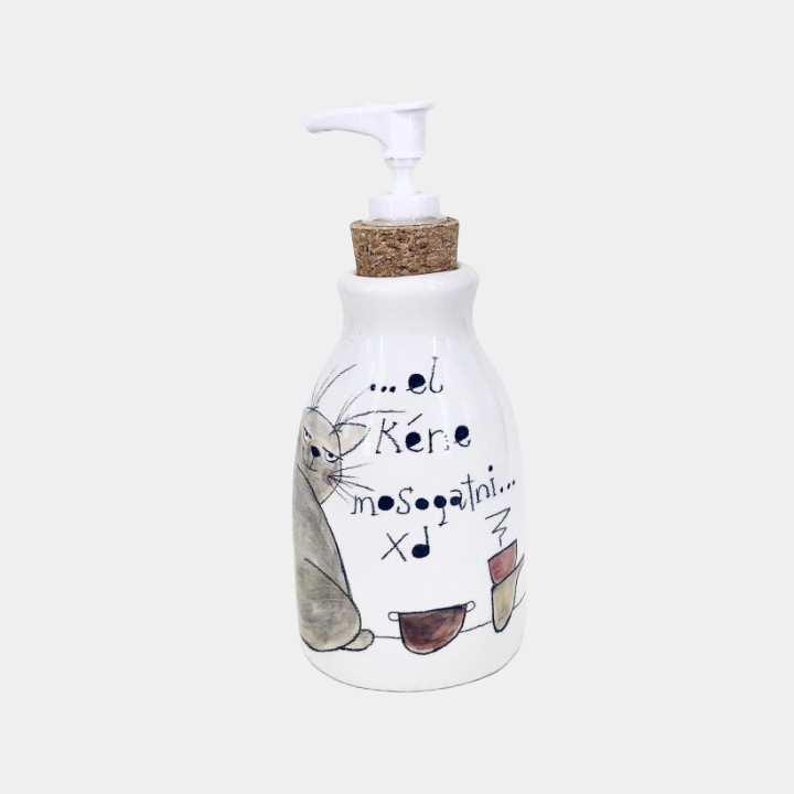 Kézzel készített és festett kerámia mosogatószer adagoló, cicás mintával, vicces felirattal.