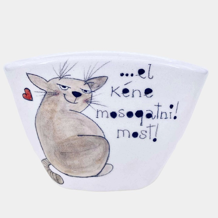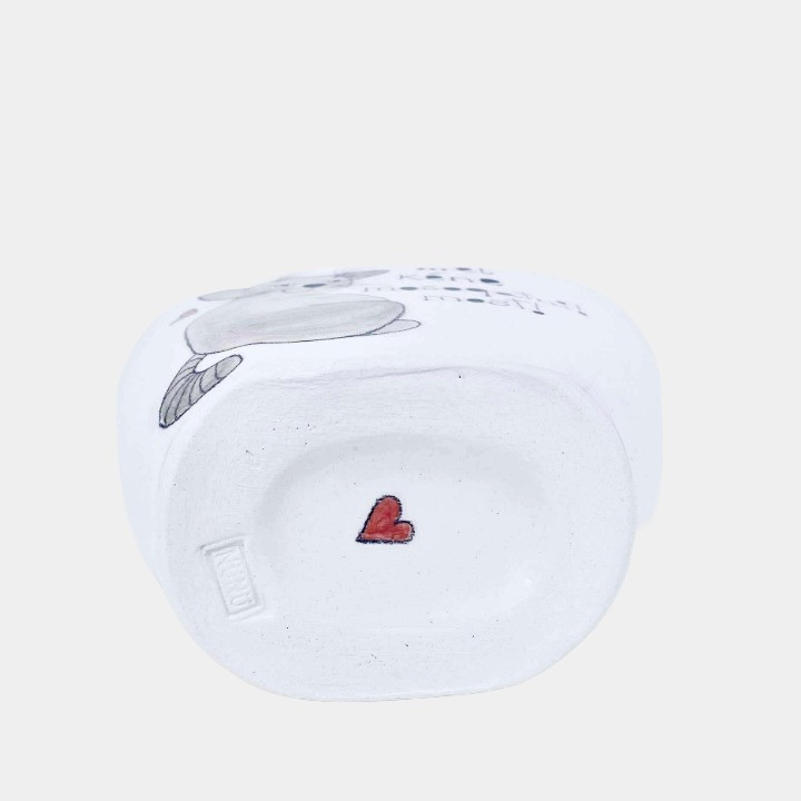 Minden termék egyesével korongolva készül, Nünü kézzel festi rá a kedves mintákat, humoros feliratokat, így nincs két egyforma darab, két egyforma minta. 1070°C-on égeti ki őket.