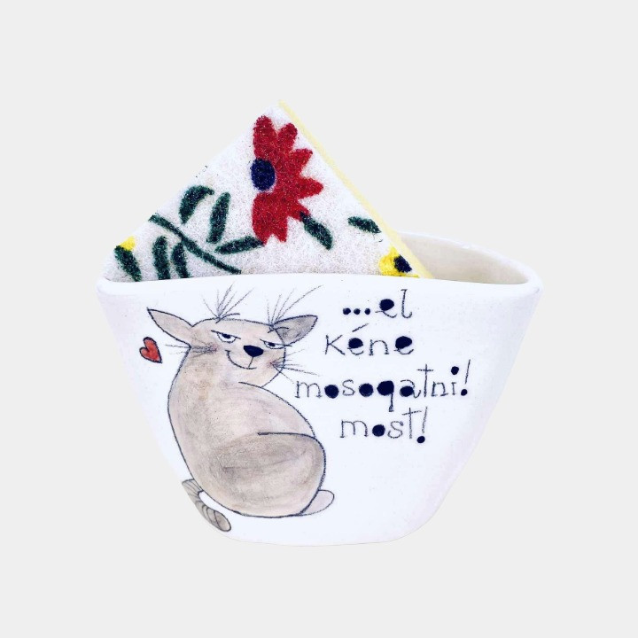 Kézzel készített és festett kerámia mosogatószivacs tartó, cicás mintával, vicces felirattal.