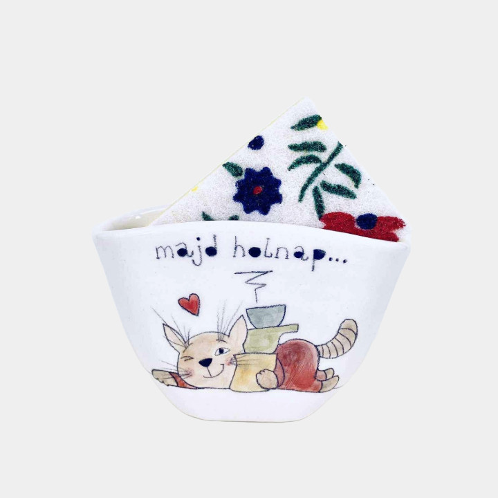 Kézzel készített és festett kerámia mosogatószivacs tartó cicás mintával, vicces felirattal.