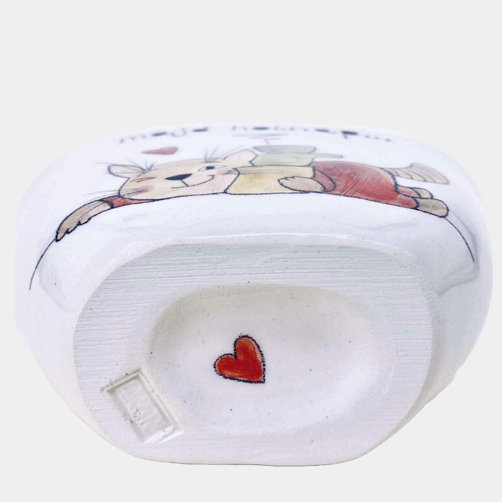 Minden termék egyesével korongolva készül, Nünü kézzel festi rá a kedves mintákat, humoros feliratokat, így nincs két egyforma darab, két egyforma minta. 1070°C-on égeti ki őket.