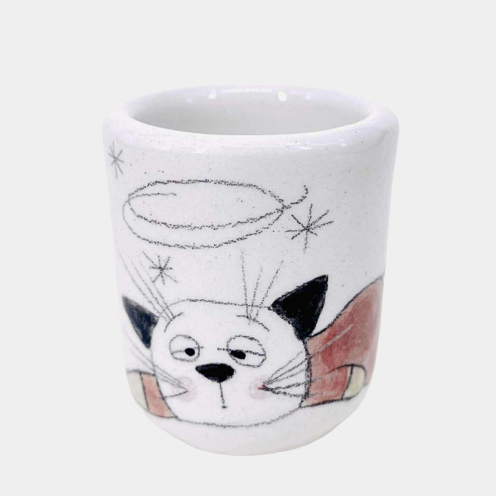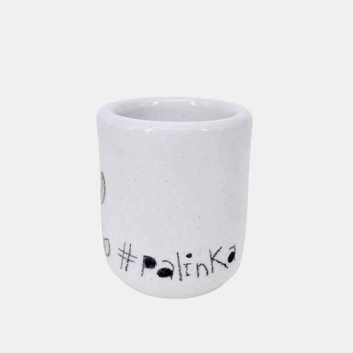Kézzel készített és festett pálinkás pohár, cicás mintával és #palinka felirattal.