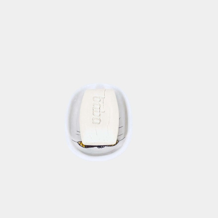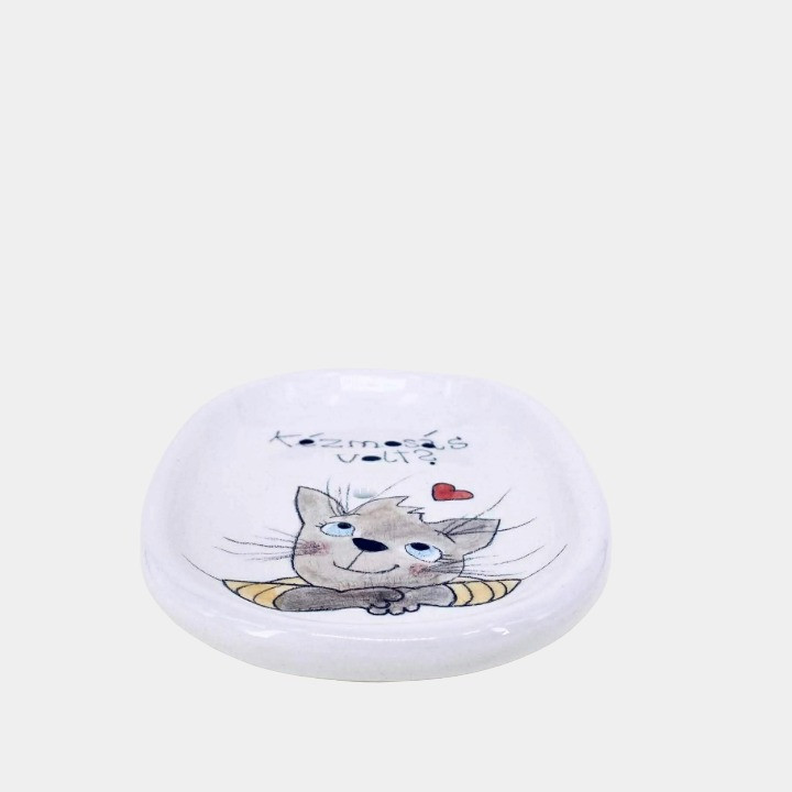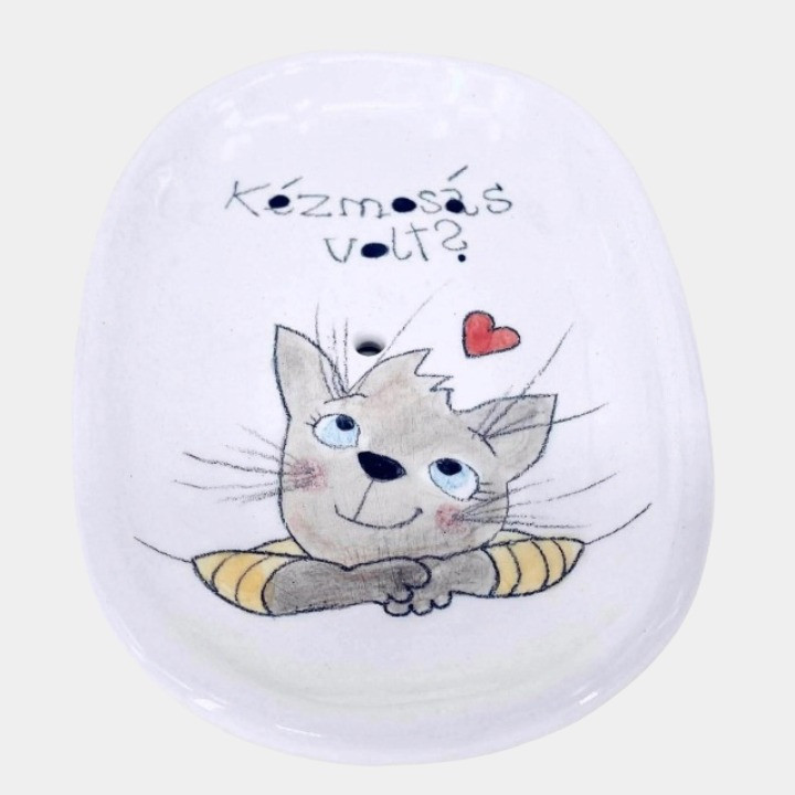 Kézzel készített és festett kerámia szappantartó, cicás mintával és vicces felirattal.