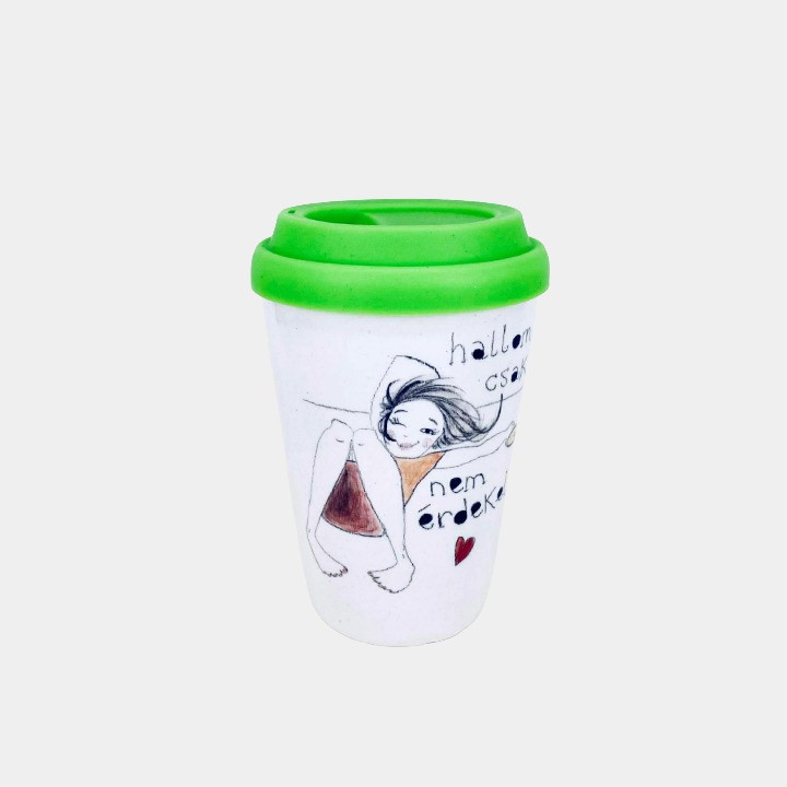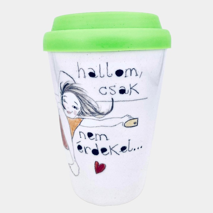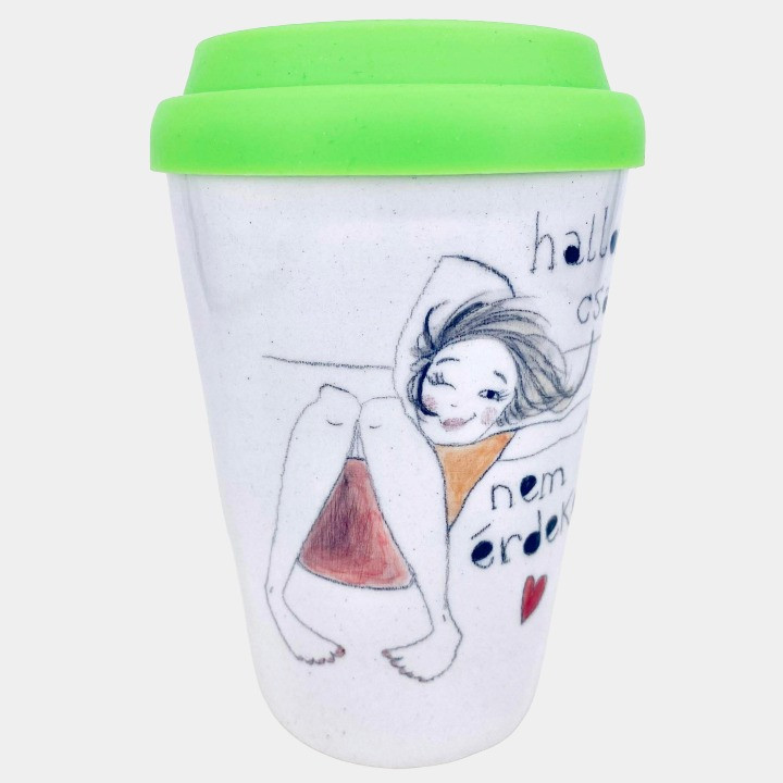 Kézzel készített és festett fül nélküli bögre, csajos mintával, vicces felirattal, szilikon tetővel.