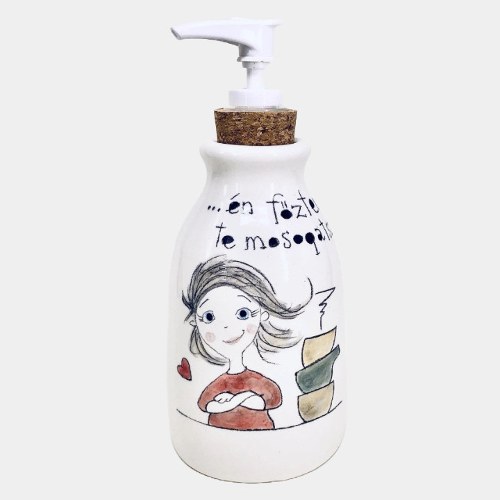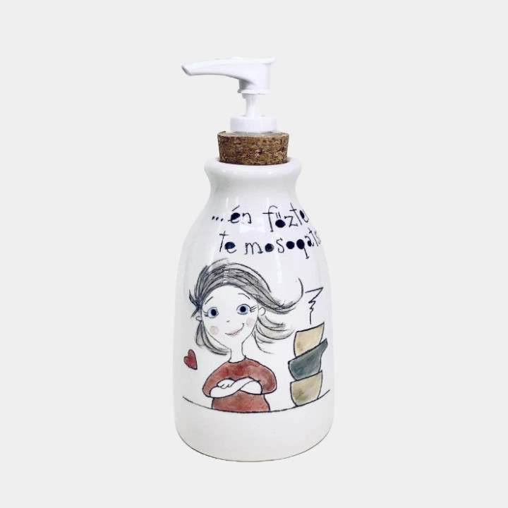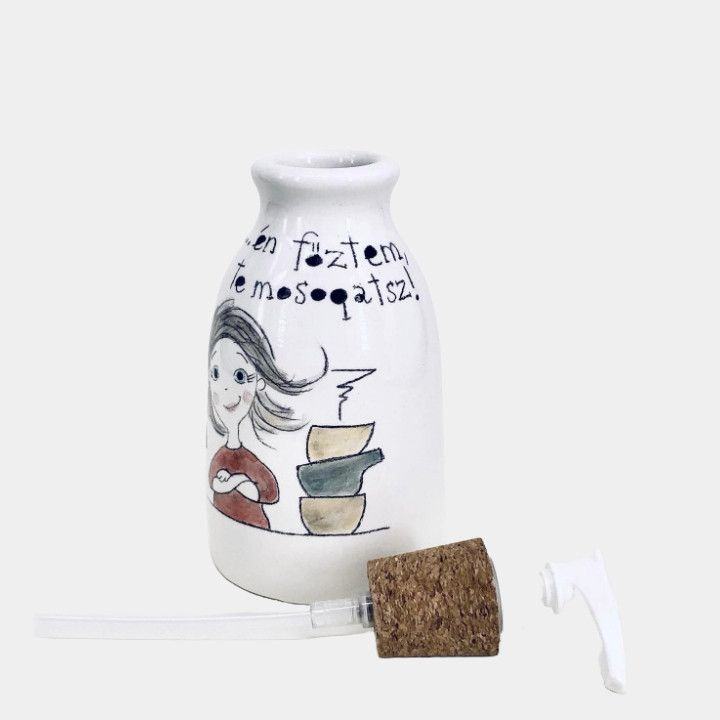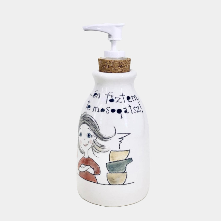 Kézzel készített és festett kerámia mosogatószer adagoló, csajos mintával, vicces felirattal.