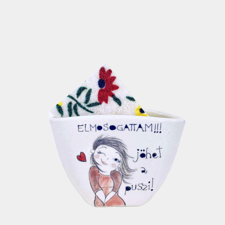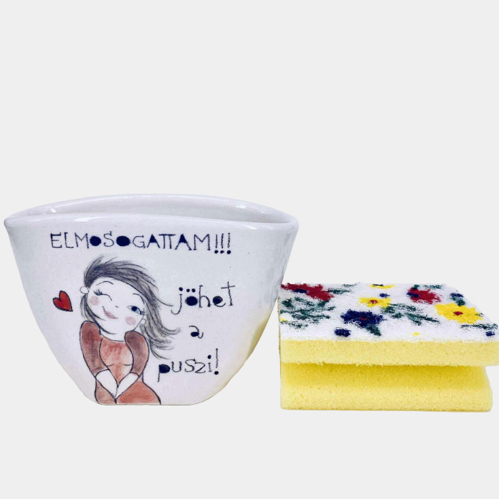 Kézzel készített és festett kerámia mosogatószivacs tartó, csajos mintával, vicces felirattal.