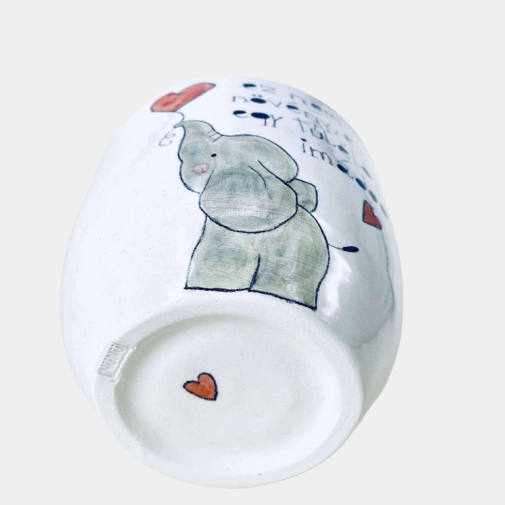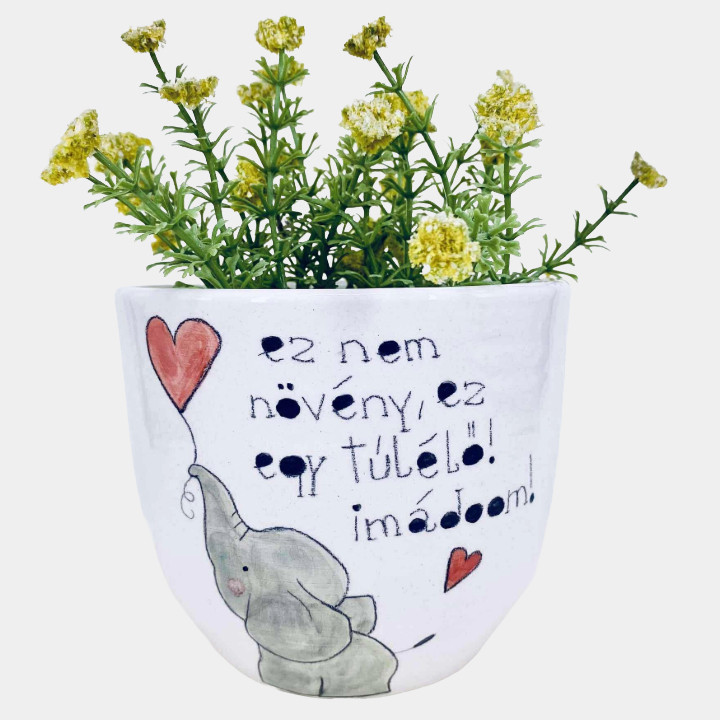 Kézzel készített és festett kaspó, elefántos mintával és vicces felirattal.