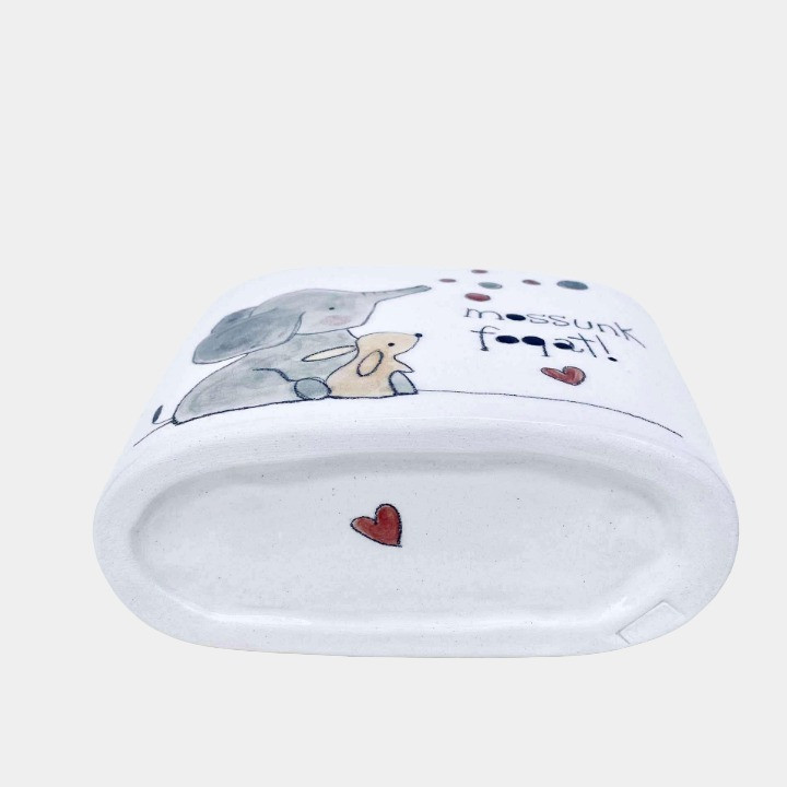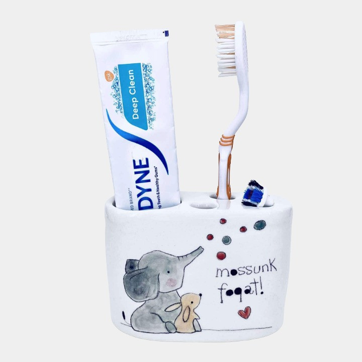 Kézzel készített és festett kerámia fogkefetartó, elefántos-nyuszis mintával, kedves felirattal.