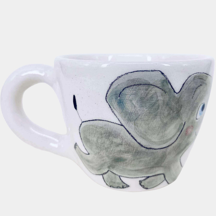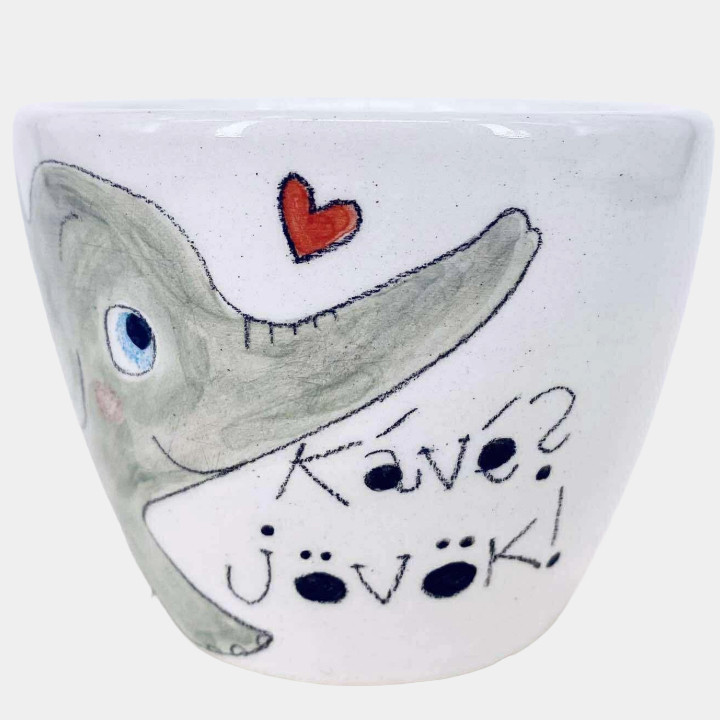 Kézzel készített és festett cappuccino csésze, elefántos mintával és vicces felirattal.