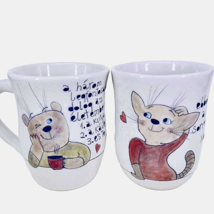 2 db összetartozó, kézzel készített és festett bögre, macis-cicás mintával és vicces felirattal.