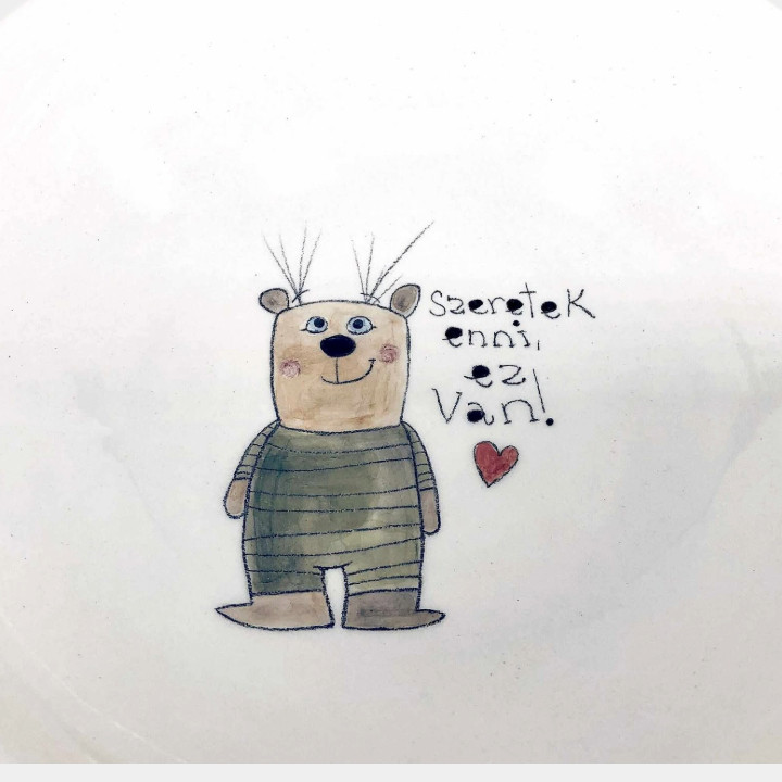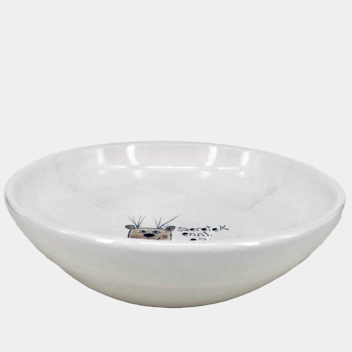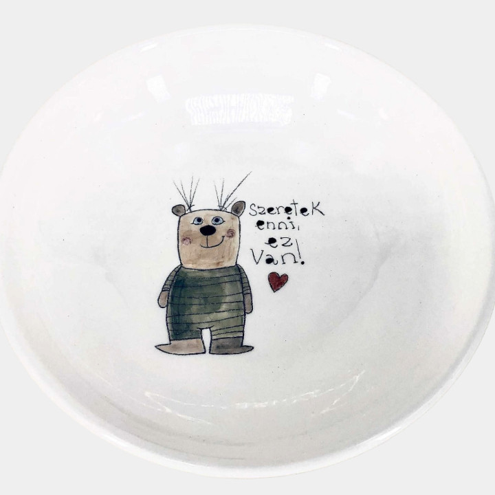 Kézzel készített és festett mélytányér, macis mintával és kedves felirattal.