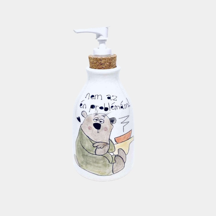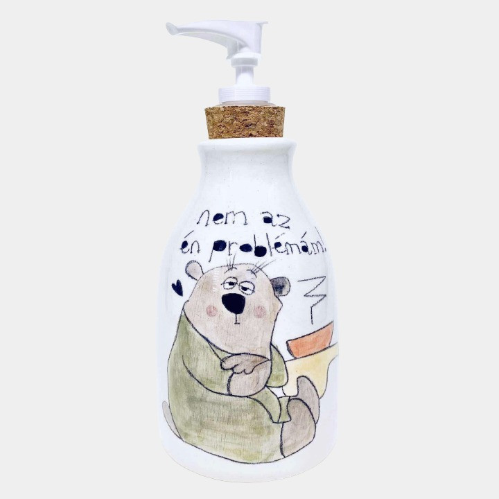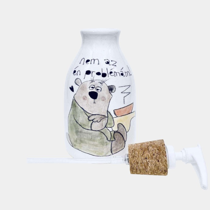 Kézzel készített és festett kerámia mosogatószer adagoló, macis mintával, vicces felirattal.