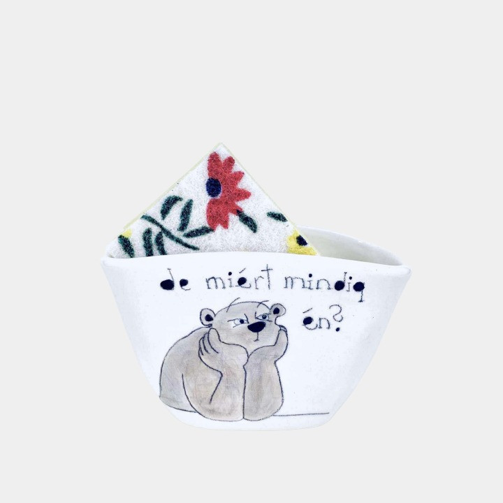 Kézzel készített és festett kerámia mosogatószivacs tartó, macis mintával, vicces felirattal.