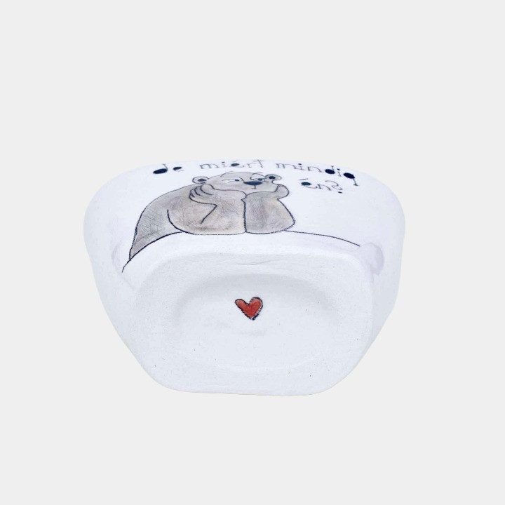 Minden termék egyesével korongolva készül, Nünü kézzel festi rá a kedves mintákat, humoros feliratokat, így nincs két egyforma darab, két egyforma minta. 1070°C-on égeti ki őket.