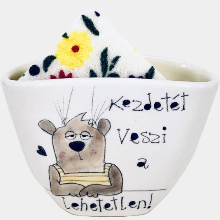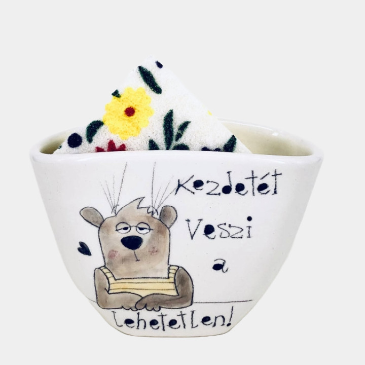 Kézzel készített és festett kerámia mosogatószivacs tartó, macis mintával, vicces felirattal.