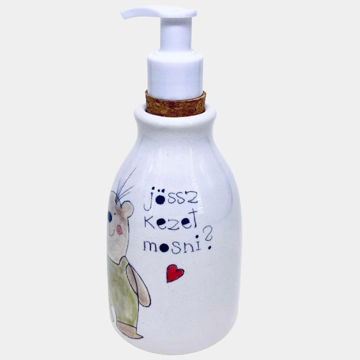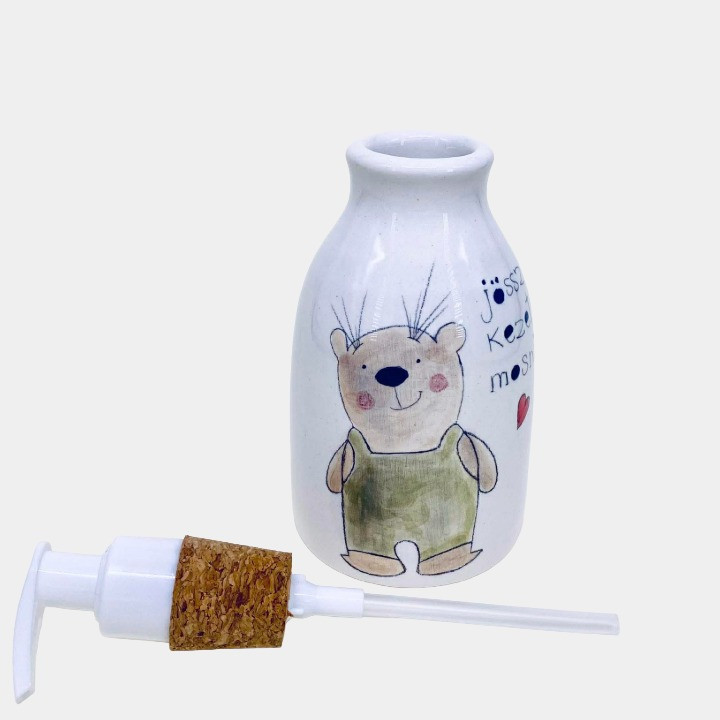 Kézzel készített és festett kerámia szappanadagoló, macis mintával, kedves felirattal.