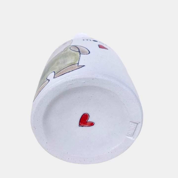 Minden termék egyesével korongolva készül, Nünü kézzel festi rá a mintákat és feliratokat, így nincs két egyforma darab, két egyforma minta. 1070°C-on égeti ki őket.