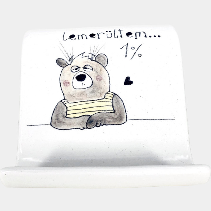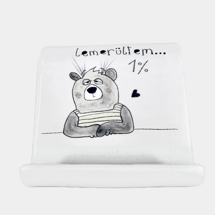 Kézzel készített és festett kerámia telefontartó, macis mintával, humoros felirattal.