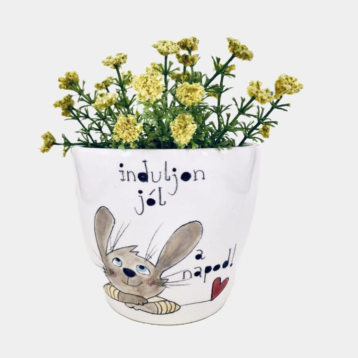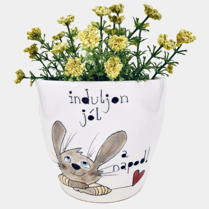 Kézzel készített és festett kaspó, nyuszis mintával, kedves felirattal.
