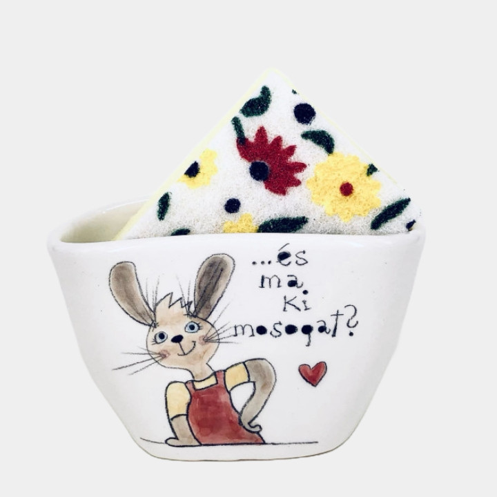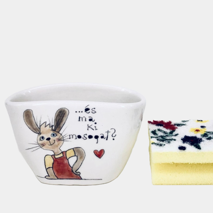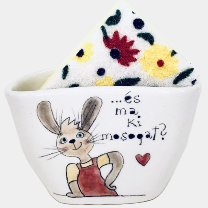 Kézzel készített és festett kerámia mosogatószivacs tartó, nyuszis mintával, vicces felirattal.