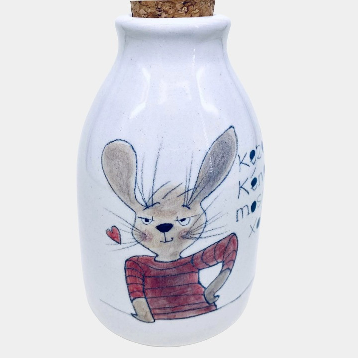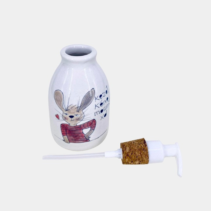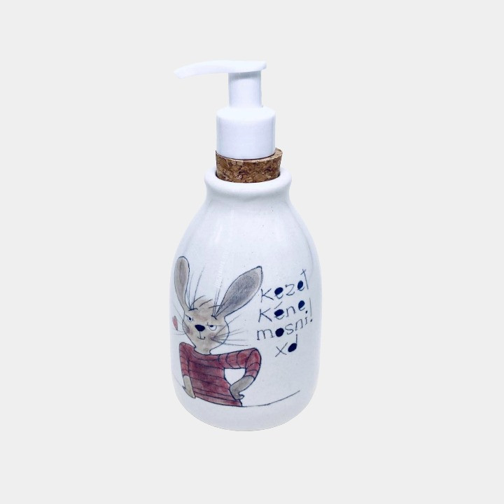 Kézzel készített és festett kerámia szappanadagoló, nyuszis mintával, kedves felirattal.