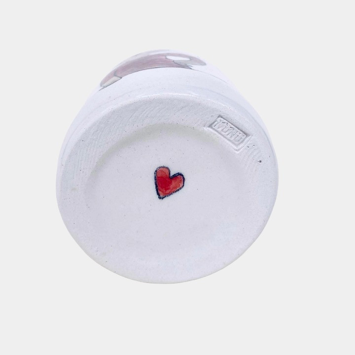 Minden termék egyesével korongolva készül, Nünü kézzel festi rá a kedves mintákat, humoros feliratokat, így nincs két egyforma darab, két egyforma minta. 1070°C-on égeti ki őket.