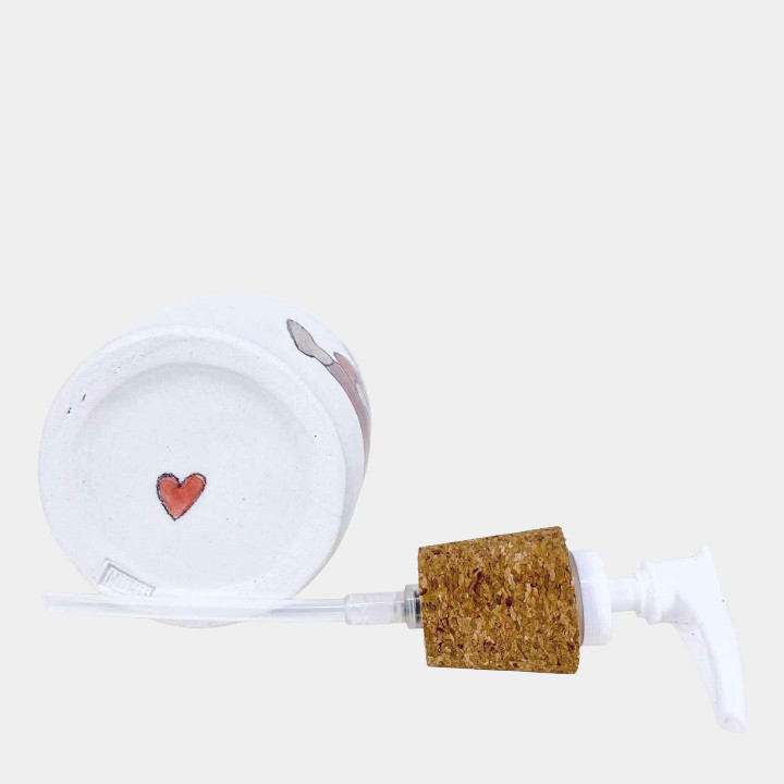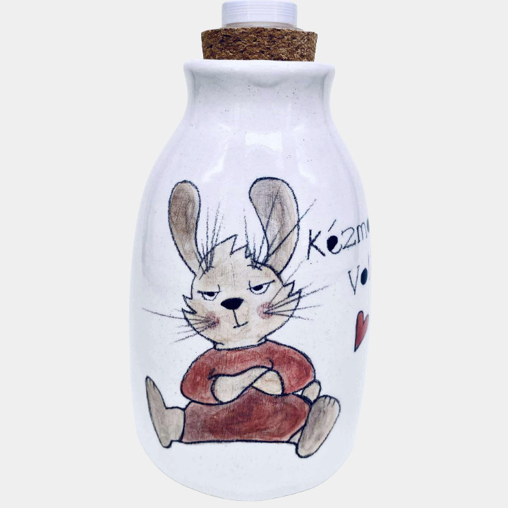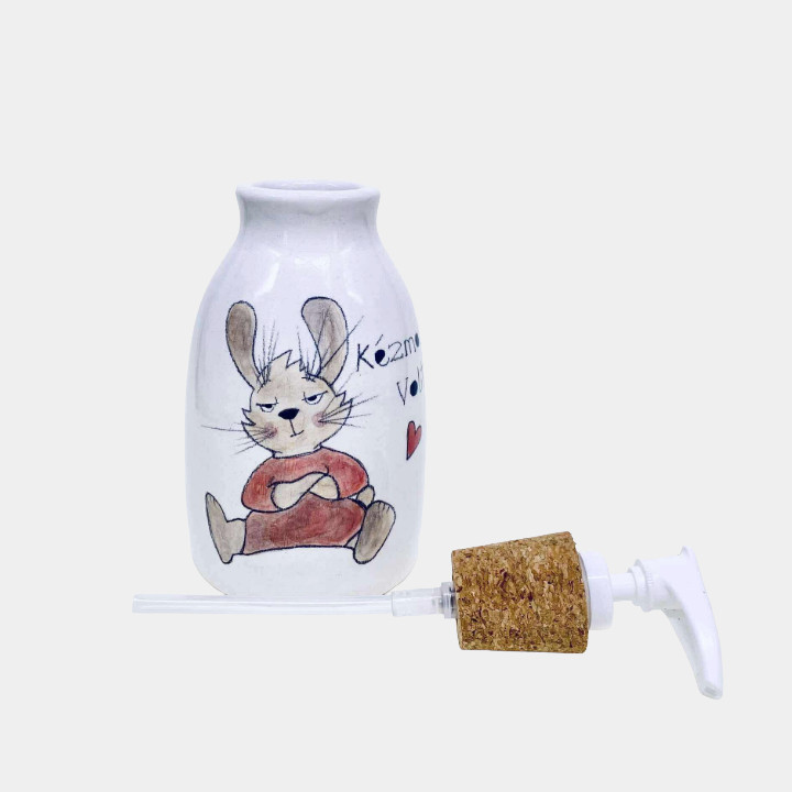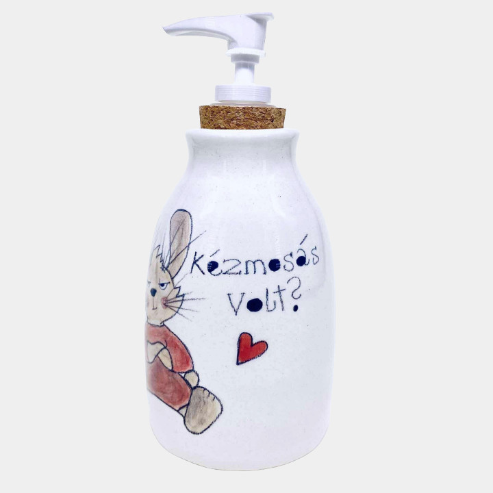 Kézzel készített és festett kerámia szappanadagoló, nyuszis mintával, kedves felirattal.
