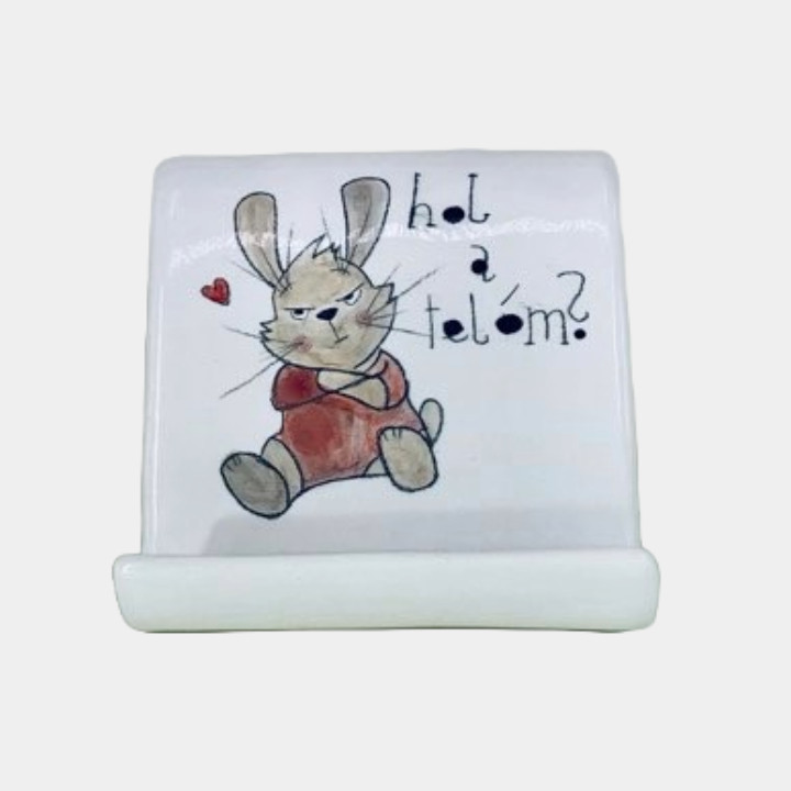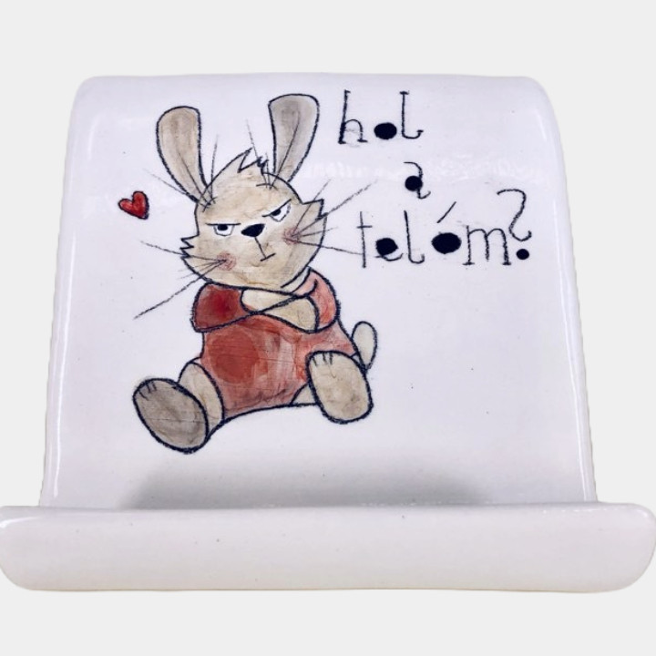 Kézzel készített és festett kerámia telefontartó, nyuszis mintával, humoros felirattal.