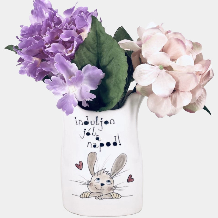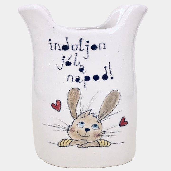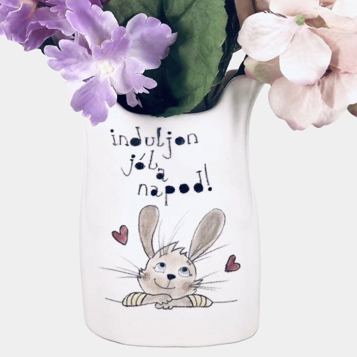 Kézzel készített és festett váza, nyuszis mintával, kedves felirattal.