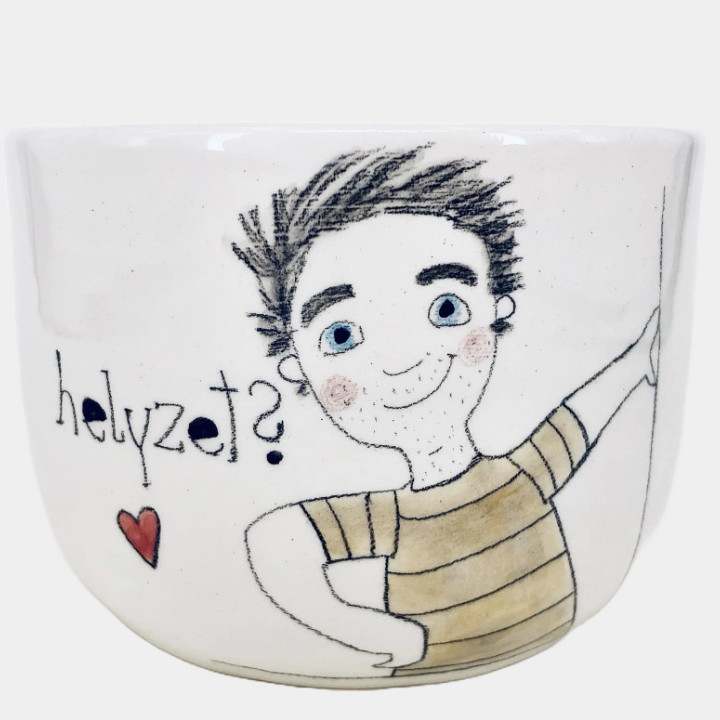 Kézzel készített és festett müzlis tál, pasis mintával és vicces felirattal.