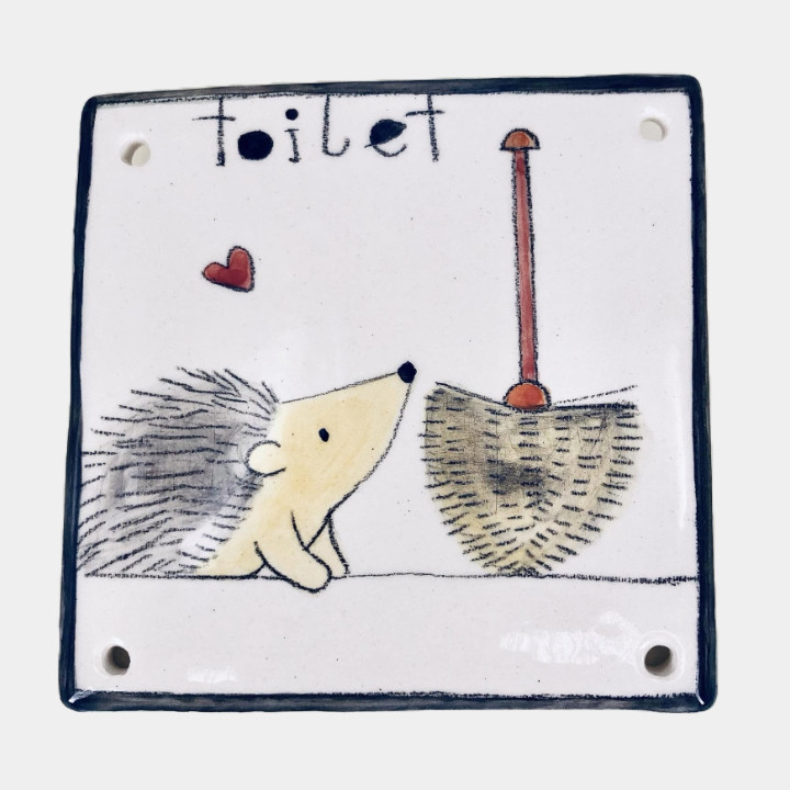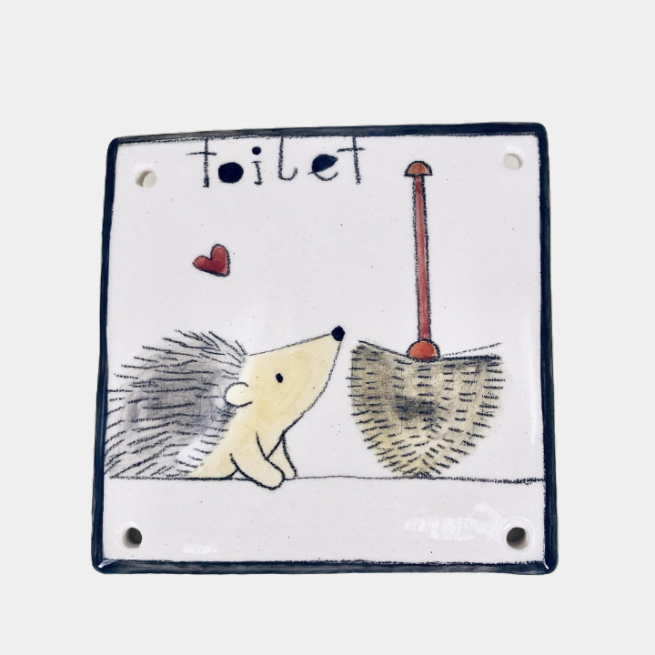 Kézzel készített és festett kerámia tábla, vicces sünis mintával, toilet felirattal.