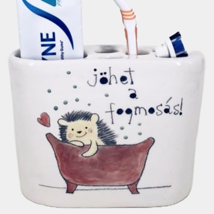 Kézzel készített és festett kerámia fogkefetartó, sünis mintával és kedves felirattal.