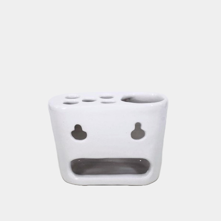 10 cm magas, 15 cm széles, 5 cm mély. Öt hagyományos, vagy elektromos fogkefét és a fogkrémet lehet beletenni. Könnyen tisztítható, falra is akasztható.