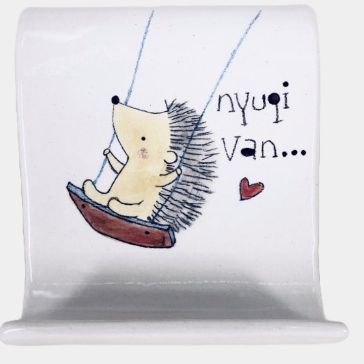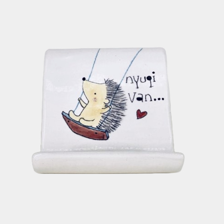 Kézzel készített és festett kerámia telefontartó, sünis mintával, humoros felirattal.