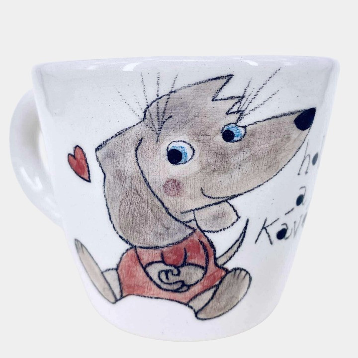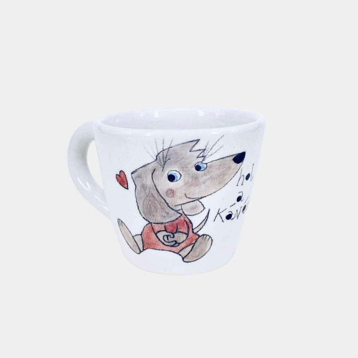 Kézzel készített és festett cappuccino csésze, kutyás mintával és vicces felirattal.