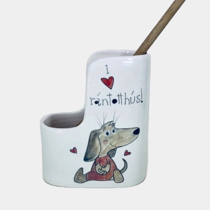 Kézzel készített és festett fakanáltartó, tacsis mintával és vicces felirattal.