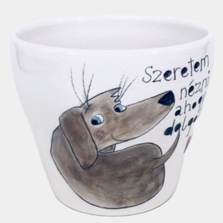 Kézzel készített és festett bögre, kutyás mintával és vicces felirattal.