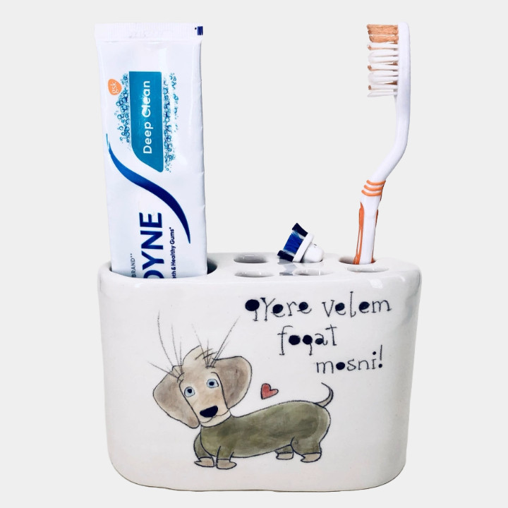 Kézzel készített és festett kerámia fogkefetartó, tacsis mintával, kedves felirattal.