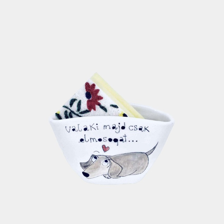Kézzel készített és festett kerámia mosogatószivacs tartó, tacsis mintával, vicces felirattal.