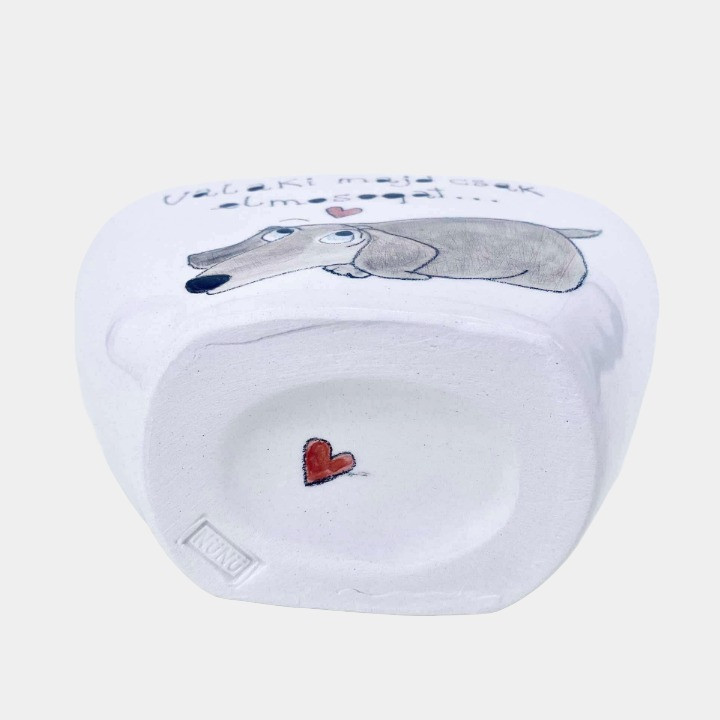 Minden termék egyesével korongolva készül, Nünü kézzel festi rá a kedves mintákat, humoros feliratokat, így nincs két egyforma darab, két egyforma minta. 1070°C-on égeti ki őket.