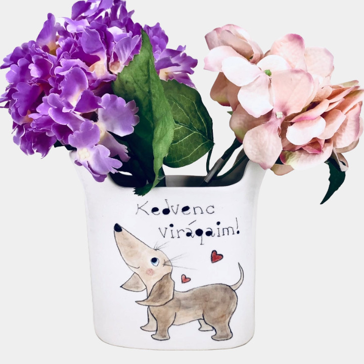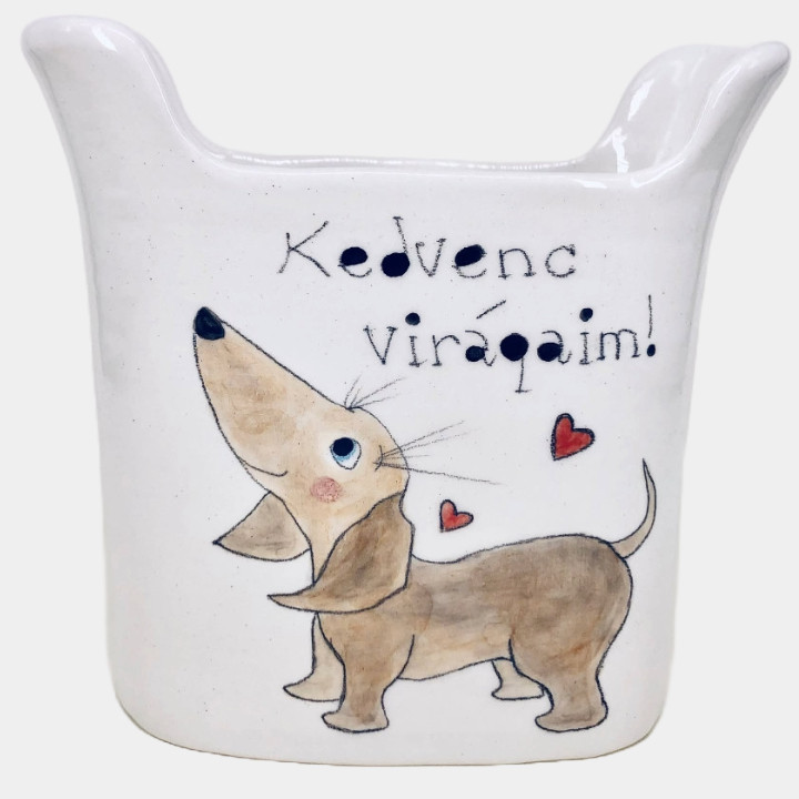 Kézzel készített és festett váza, tacsis mintával, kedves felirattal.
