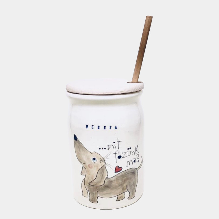 Kézzel készített és festett vegeta tartó, cuki tacsival és vicces felirattal.